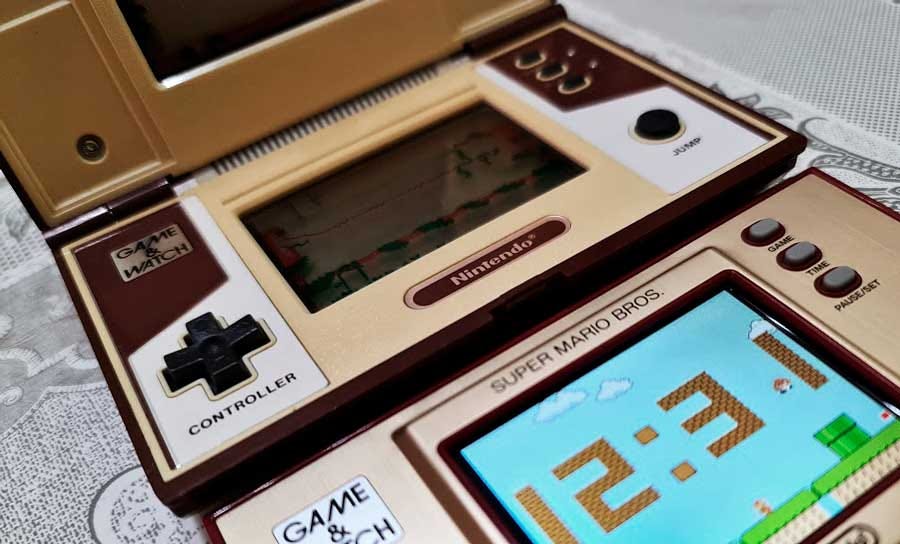 Las «maquinitas» que anticiparon las consolas portátiles abrieron la veda al juego portátil con unas pantallas LCD monocromo que ofrecían movimientos muy limitados. Game & Watch como ésta del Donkey Kong, enfrentada a la reciente revisión de Nintendo, son toda una joya: la que veis aquí tiene más de 30 años.